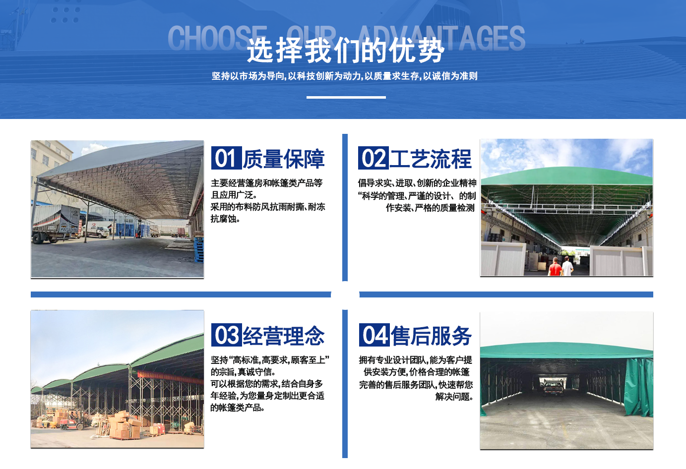 遼寧拓圖鋼結構工程有限公司是一家專業(yè)從事推拉篷設計、制作、安裝、使用、維修的綜合性公司。公司主營:電動雨棚、活動雨棚、倉庫雨棚、體育類雨棚、篷房、篷布、帳篷等系列產品的制作與安裝。 遼寧拓圖鋼結構工程有限公司堅持以市場為導向,以科技創(chuàng)新為動力,以質量求生存,以誠信為準則,倡導求實、進取、創(chuàng)新的企業(yè)精神。“科學的管理、嚴謹?shù)脑O計、 的制作安裝、嚴格的質量檢測、良好的后期服務成就企業(yè)的信譽,為您提供優(yōu)質服務。 遼寧拓圖鋼結構工程有限公司傾力于開發(fā)應用三維空間結構與新材料的結合,將廣告藝術視覺表現(xiàn)形式與張力膜材科學的結合,推出多彩推拉蓬,依靠先進的科學技術,將推拉蓬建筑表現(xiàn)形式無限延伸,立志走在建筑科學的前沿,引導建筑時尚潮流,我們的目標是使推拉蓬建筑在中國發(fā)展壯大。 遼寧拓圖鋼結構工程有限公司憑著極強的事業(yè)熱情和豐富的專業(yè)經驗以“勤勉進取、銳意創(chuàng)新、至誠至信”的精神使公司得到迅速健康發(fā)展,業(yè)務范圍遍及全國。科學的管理、嚴謹?shù)脑O計、高標準的制作安裝流程,嚴格把控產品質量,熱誠的售后服務是企業(yè)競爭力的源泉。 遼寧拓圖鋼結構工程有限公司人愿以最誠摯的態(tài)度,歡迎廣大客戶的蒞臨與溝通!愿為市場提供優(yōu)...